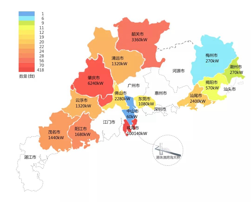 2018年,在港珠澳大桥充电桩项目中,铜陵培林装饰工程有限公司在港珠澳大桥珠海端口岸人工岛搭建的充电管理平台及电能量采集终端,为大桥的绿色运营和电力保障提供技术支持。除此之外,仅广东省内,铜陵培林装饰工程有限公司充电桩涵盖肇庆、珠海等14个城市,具体分布情况如下图所示。